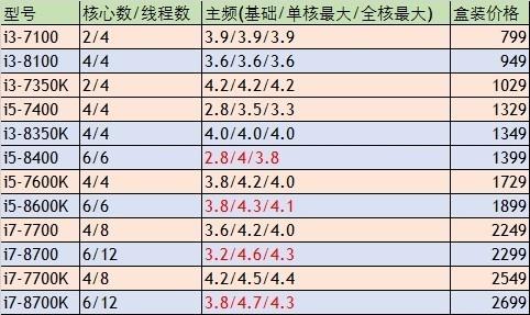 八代酷睿处理器依旧采用14nm工艺,但是处理器核心数量有了很大提升。i3系统4核心4线程、i5则为6核心6线程、i7升级成6核心12线程。