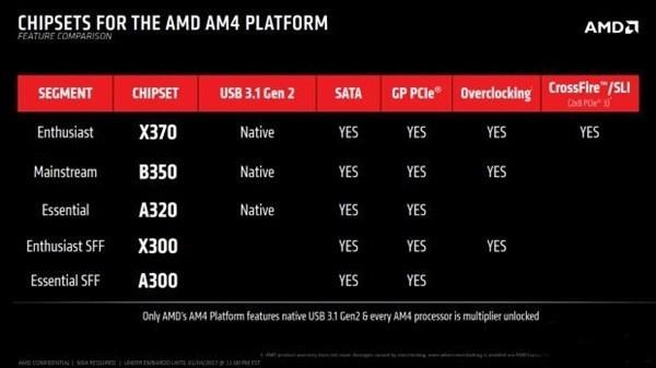 AMD方面,X370主板是AM4的高端型号,功能也比较全。比如PCI-E 3.0、USB 3.1、M.2、DDR4、SLI交火等一应俱全。到了B350除了不支持显卡交火外其余功能都相同,性价比非常高。A320是AM4的入门主板,不支持超频,减少了USB和PCI-E通道数量,但仍然保留了M.2接口,适合入门级玩家使用。
