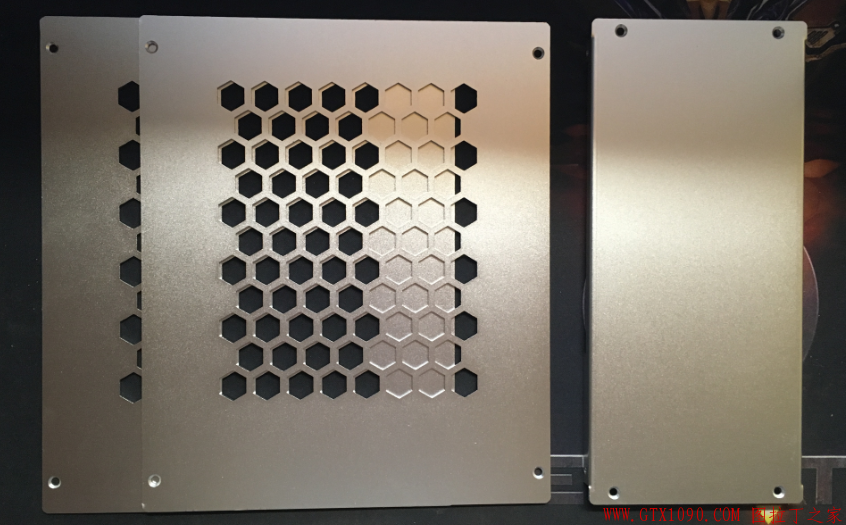 可以看到,机箱的两块侧板、前面板以及主体框架的表面均采用了氧化喷砂工艺,质感还是不错的。但是要注意的一点是铝合金的硬度有限,在装配的时候使用工具千万要小心,一旦划伤会十分影响观感。
