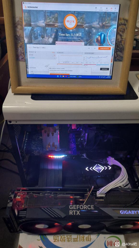 待机21度,烤鸡最高不超过60,如果自己调满风扇会更低。实现神光同步 ,线都是自己改造的之前的篇章教过怎么改,屏幕是用iPad自己改的2k屏名副其实的捡垃圾手工 。游戏测试拉满画质的话温度也不会太高,降功耗温度会更低。3dmark压力测试通过率百分之99.2。