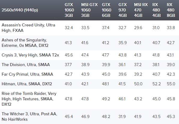 测试的八款游戏为《刺客信条:大革命》、《奇点灰烬》、《孤岛危机3》、《全境封锁》、《孤岛惊魂:原始杀戮》、《杀手》、《古墓丽影:崛起》和《巫师:狂猎》,其中《奇点灰烬》和《杀手》都运行在DirectX 12 API,作为对比,同场竞技的还有Radeon RX 480 4GB、RX 480 8GB。需要预先说明的,虽然RX 480在不同的显存版本只有4GB、8GB之别,但是对于GTX 1060,3GB、6GB之间还有流处理器的区别。